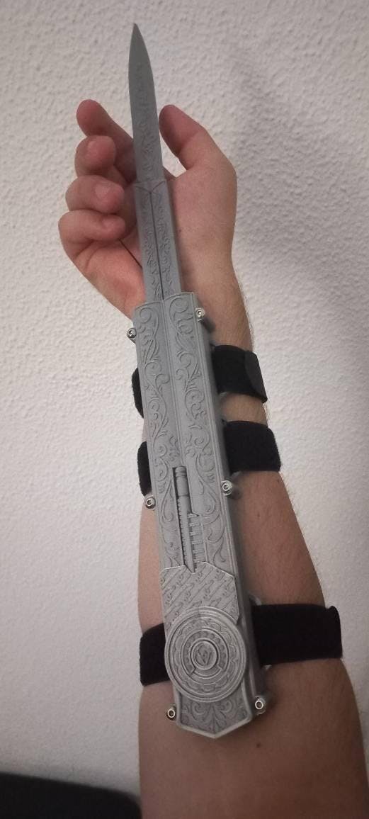 I've been following Rawice since I was basically in my late teens when everyone on YouTube was making hidden blades, but his designs went above and beyond the norm to fully emulate the feeling of being an assassin. The blade is printed beautifully and looks like it's made from metal, the design is intricate, and the blade action is smooth. Do watch the tutorial videos though to get the best result for deploying and retracting the blade; the "C" hand motion works wonders. A few different ring sizes were even thrown in, which worked out very well because I underestimated my ring size, and the leather riser I got with it complements the blade beautifully. If/when a hook blade version gets made, I'm absolutely going to be buying it. Glad that you've been able to turn this into a successful venture!