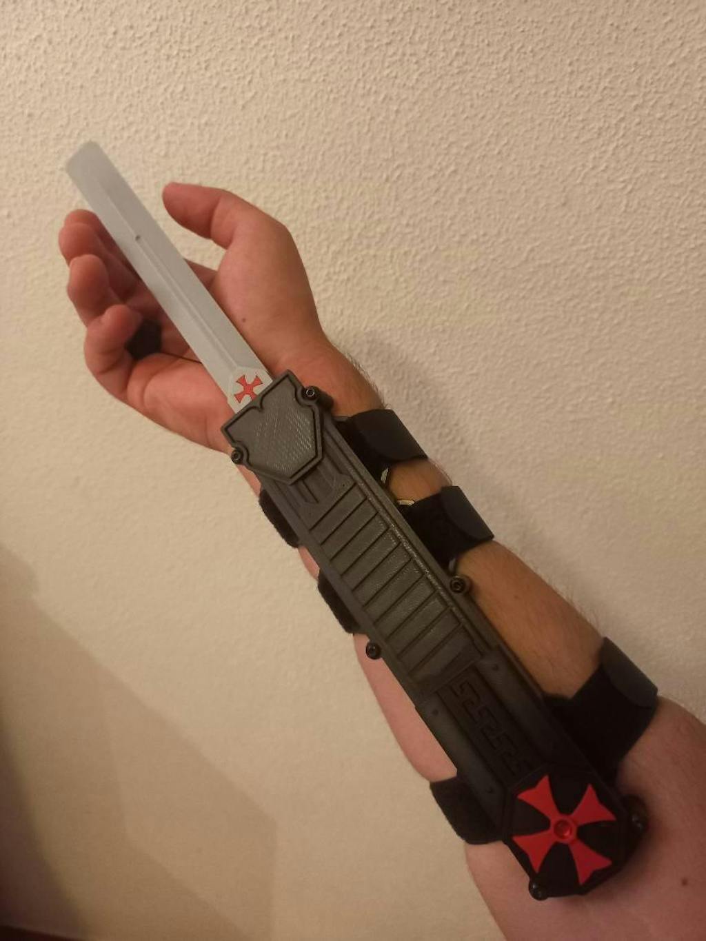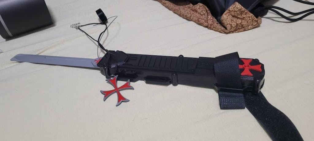 Built for both durability and detail, the base and mechanical components are injection-moulded, making it one of the most reliable hidden blades on the market. The outer Rogue 'skin' and blade are 3D printed, featuring a striking red Templar logo inlay and a gemstone accent for added character.